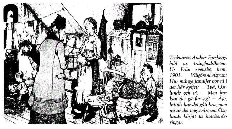 1895 bodde mer än 2/3 av Stockholms befolkning i lägenheter på ett rum och kök, eller enbart kök (s k spisrum). I närmare hälften av ettorna hade man dessutom inneboende(!). 42 % av enrumslägenheterna var överbefolkade, medan motsvarande siffra för Berlin var 26 %.