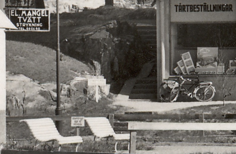 Och på andra sidan gatan fanns en telefonkiosk – telefon i hemmet var ingen självklarhet. Observera även cykeln med sidvagn (längst ner till höger på stora bilden).