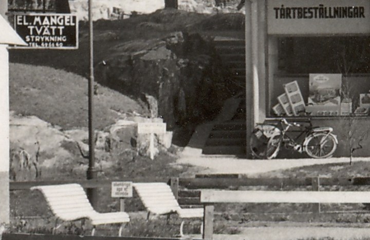 Nedan: Samma vy och samma butiker som på föregående bild, men här har även Konsum längst till vänster kommit med. Bilden är troligen lite nyare, för här syns inga byggnadsställningar och en bit upp i backen mittemot telefonkiosken har det tillkommit en kiosk – förutom alla butiker. Dessutom har buskarna vuxit upp och döljer den lilla uteplatsen på berget bakom kiosken.