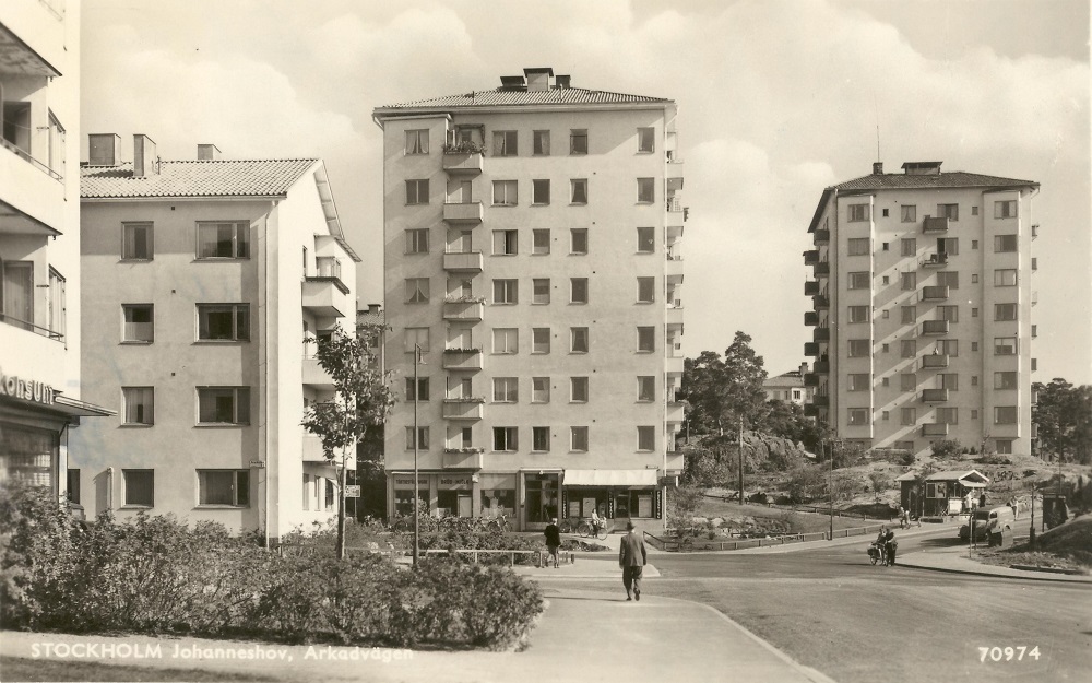 Från Arkadvägen/Pastellvägen finns två bilder, NÄSTAN likadana: En bit in på Arkadvägen ser vi höghus, som verkar sprillans nya. Några byggställningar skymtar fortfarande längst till höger och på det huset verkar inte balkongerna vara riktigt färdiga. Men butikerna är på plats – från vänster till höger bara i detta lilla hörn: El. Mangel Tvätt Strykning, Tårtbeställningar, Bröd och mjölk – där säljs bland annat VEXOS goda soppa. På andra sidan porten finns Hattpress (samt omstockning av hatt!), Kemtvätt, Pressning samt Hammarby Herr- och Damskrädderi. Kemtvätten verkar kosta 3 kronor för hatt, 9 för kostym eller dräkt.