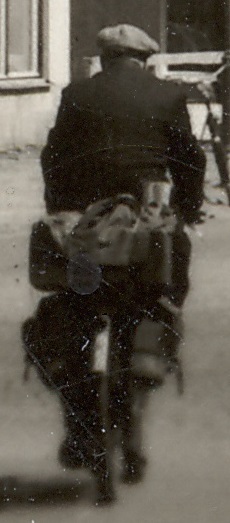 På gaveln på höger sida finns en Frisörskylt och bakom den en till, delvis skymd, gissning inom parentes: ”Under(kläder?) Str(ykning?). Dessutom skymtar här mjölkkannor – på väg tillbaka till Mjölkcentralen?