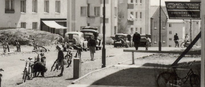 På gatan framför, bland alla cyklarna, står en rad med bilar utrustade med gengasaggregat, en av dem verkar ha vedsäck på taket. Det kunde behövas vid längre resor i bensinransoneringens Sverige, läser jag på sidan Gashistoria – gengas Ofarligt var det inte heller: 1941 inträffade i Sverige ett dussintal dödsolyckor pga gengas-kvävning och ett hundratal personer var nära döden. Och det tog ett tag efter kriget innan bensinen räckte åt alla igen.