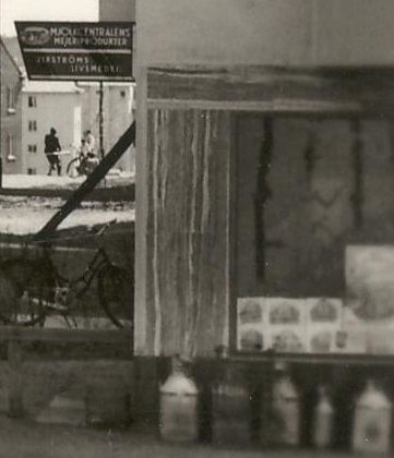 På höger sida ligger Mjölkcentralens mejeriprodukter (skyltens bild visar kossa med mjölkerska) och Vikströms Livsmedel. Mjölkkannorna är prydligt uppradade utanför knuten. Även utanför frisören tvärs över gatan står några mjölkkannor.