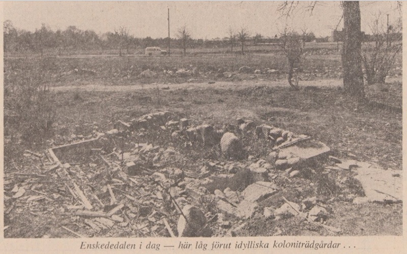 ”I min närhet revs, brändes och skövlades de idylliska koloniområdena i Enskededalen plus den vackra tallåsen. Efter denna treåriga vandalisering, åtföljd av otaliga kostbara utredningar ang ett stort fint sjukhus, som skulle byggas här, lades hela projektet ned.”