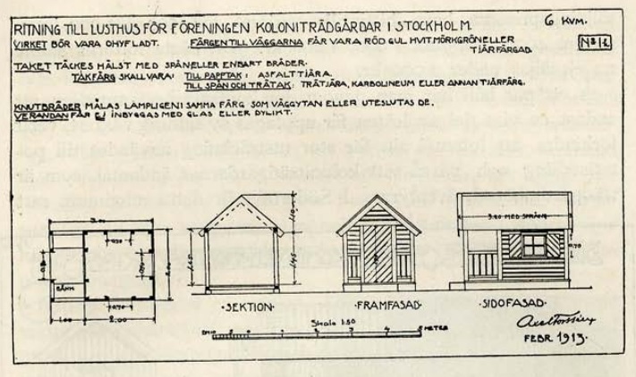 ”I början tyckte jag att man skulle lämna kolonisterna fullständig frihet ifråga om lusthusen, men sedan jag sett så osmakliga(!) saker i den vägen har jag ändrat åsikt. Nu ska vi hjälpa dem med ritning och se till att vi få små trefliga hus.”