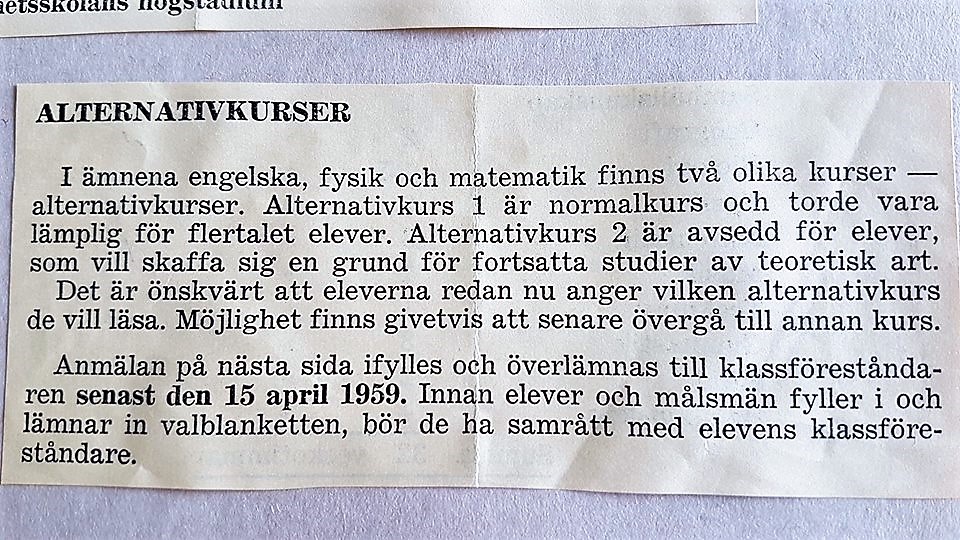 Så står det att man kunde välja om senare. Ja förvisso, men då handlade det nog mest om att välja till den lättare kursen. Jag har inget minne av detta val alls, mina föräldrar tog det för självklart att jag skulle välja alternativkurs 2.
