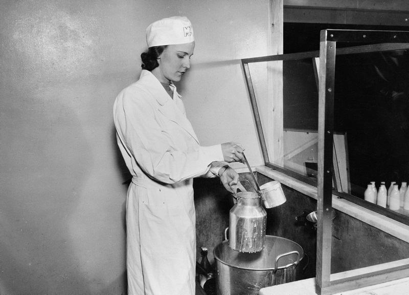 Bilden visar en kvinna på Mjölkcentralen som mäter upp mjölk i en mjölkkanna med ett så kallat långskaft. 1940-1949 Okänd fotograf (CC-BY), Stockholms stadsmuseum via Stockholmskällan.