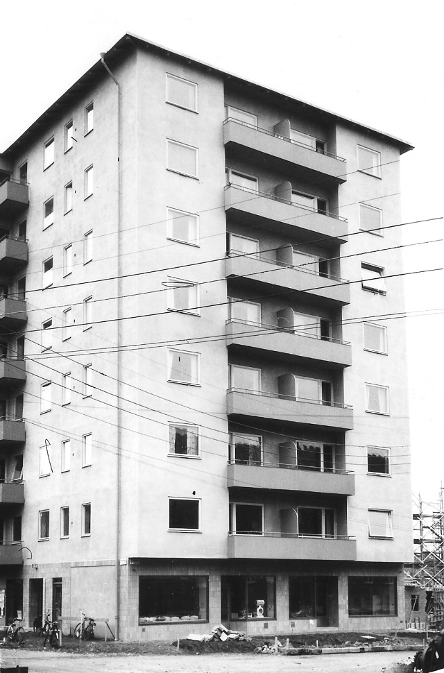 Man ser att det kommer att bli en affär på hörnet. Bakom byggbarackernaoch omgivna av byggställningar syns nr 14-16, som blev färdiga 1944. Längst bort skymtar höghusen i slutet av gatan. Flera (ganska små) lastbilar forslar byggmaterial mellan arbetsplatserna.