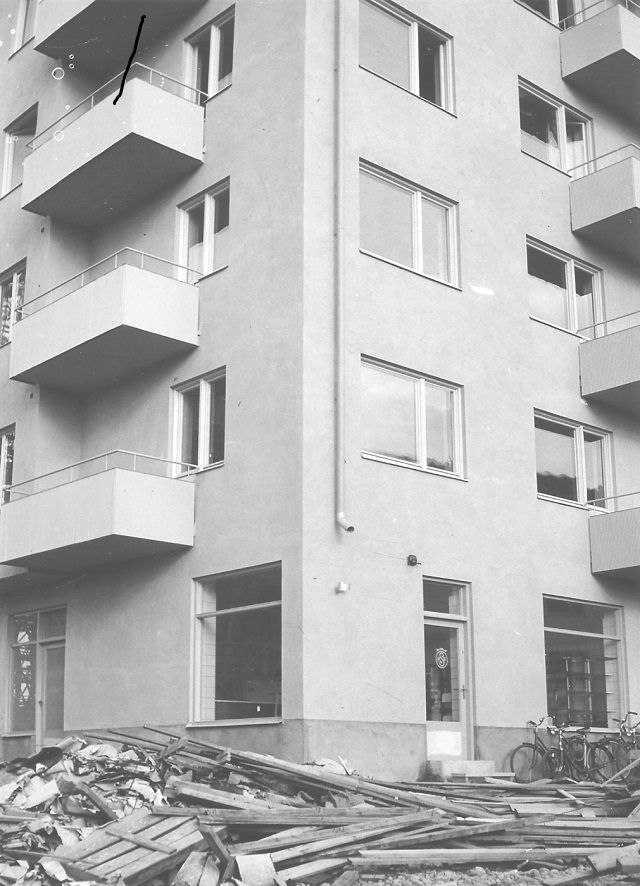 Pastellvägen nr 9 fotograferades byggåret 1943 och porten är omgiven av brädhögar. På dörren till den blivande affärslokalen syns Konsum-loggan, men skylten är ännu inte uppsatt.