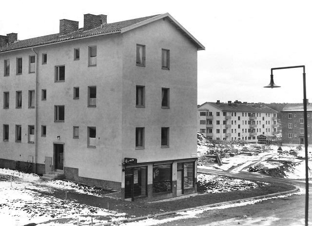Skärmarbrinksvägen 9 byggdes 1943. Bilden är från 1944 och Konsumskylten är redan uppe, men bakom huset syns en byggplats och bortom den flera nya hus.