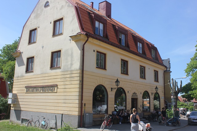 På väggen står fortfarande ”Konsumtionsföreningen”, och när affären stängde 1983 var den Stockholms förorters äldsta konsumaffär. Senare har Gamla Enskede Bageri funnits där, och sen januari 2018 finns Delselius bageri på plats. Fullt med folk trängdes i solen utanför.