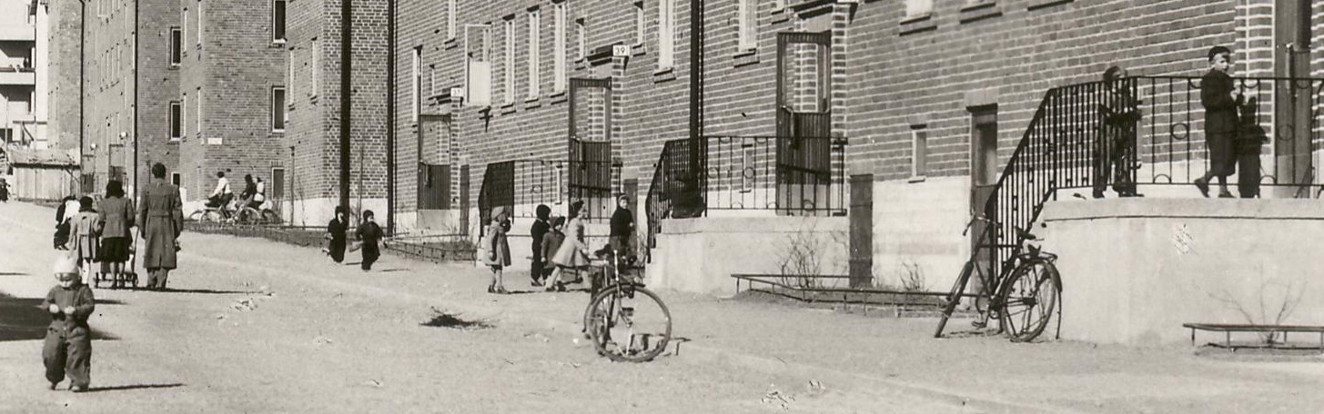 På vykortet från fyrtiotalets Skärmarbrinksväg ser man en familj med barnvagn på promenad mitt i körbanan. Inga bilar syns till, däremot cyklar och lekande barn, småbarnen i overall, flickorna i kappa och åtminstone en av pojkarna i äppelknyckarbyxor och toppluva. Det verkar vara söndag – både på klädseln och de närvarande männen.