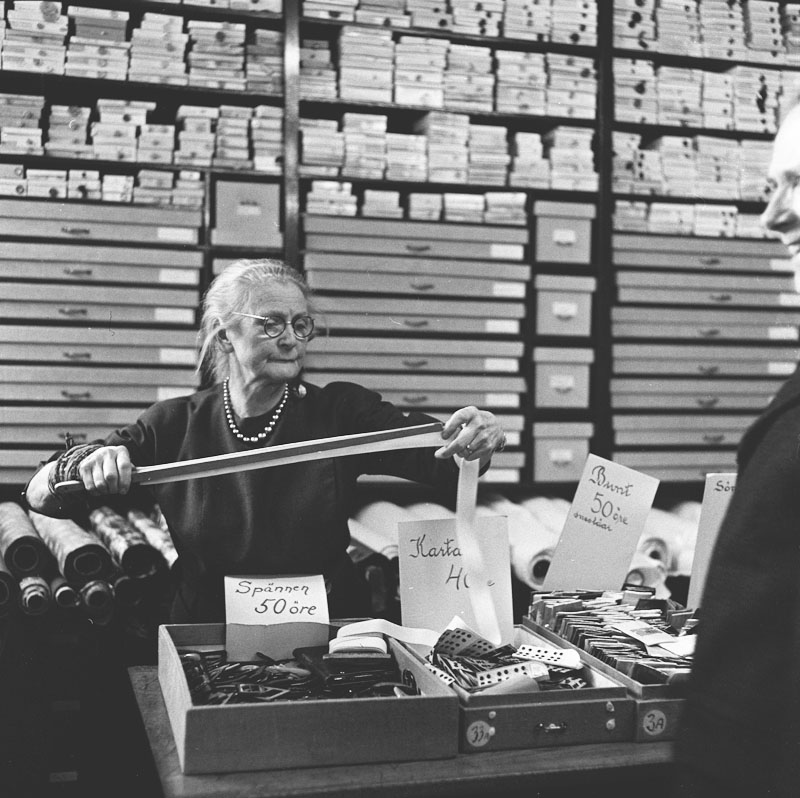 Lena minns mycket väl hur det såg ut inne på Helmstedts sybehör, vår granne på Skärmarbrinksvägen där jag ibland var med mamma och handlade och som tydligen, enligt en annons jag hittade, egentligen hette ”Anny Helmstedt Strump- Garn”. Tyvärr har jag ingen bild inifrån den affären, men inredningen var ungefär som på bilden från Kitzings sybehörsaffär på Storgatan 15 – även om jag inte tror att expediten var lika gammal.