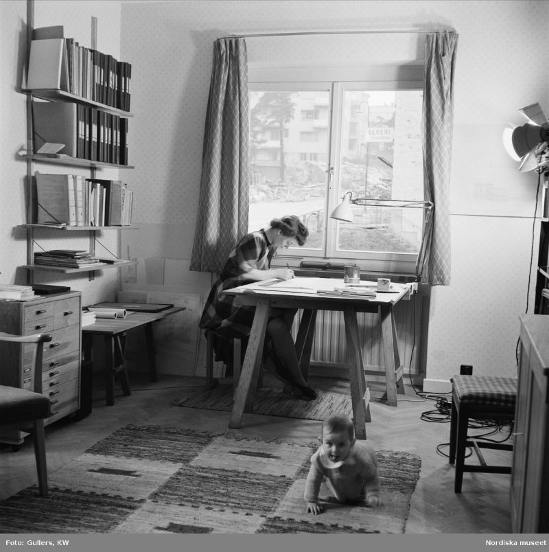 Hur var det nu med Lena Larsson och hennes slit och släng? Hennes historia var (som alltid) betydligt intressantare än så. Bilden visar ”inredningsarkitekten Lena Larsson vid sitt arbetsbord”, medan hennes lilla dotter kryper på mattan.