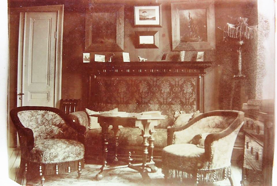 Observera hunden i högra fåtöljen! Han heter Hej och var en Jack Russel terrier. Observera även stolarna med plyschklädda kanter – typiskt för det senare 1800-talet – samt den höga paneldivanen och den vackra veckade lampskärmen. Den gustavianska byrån i högerkanten står numera i mitt parhus i England.