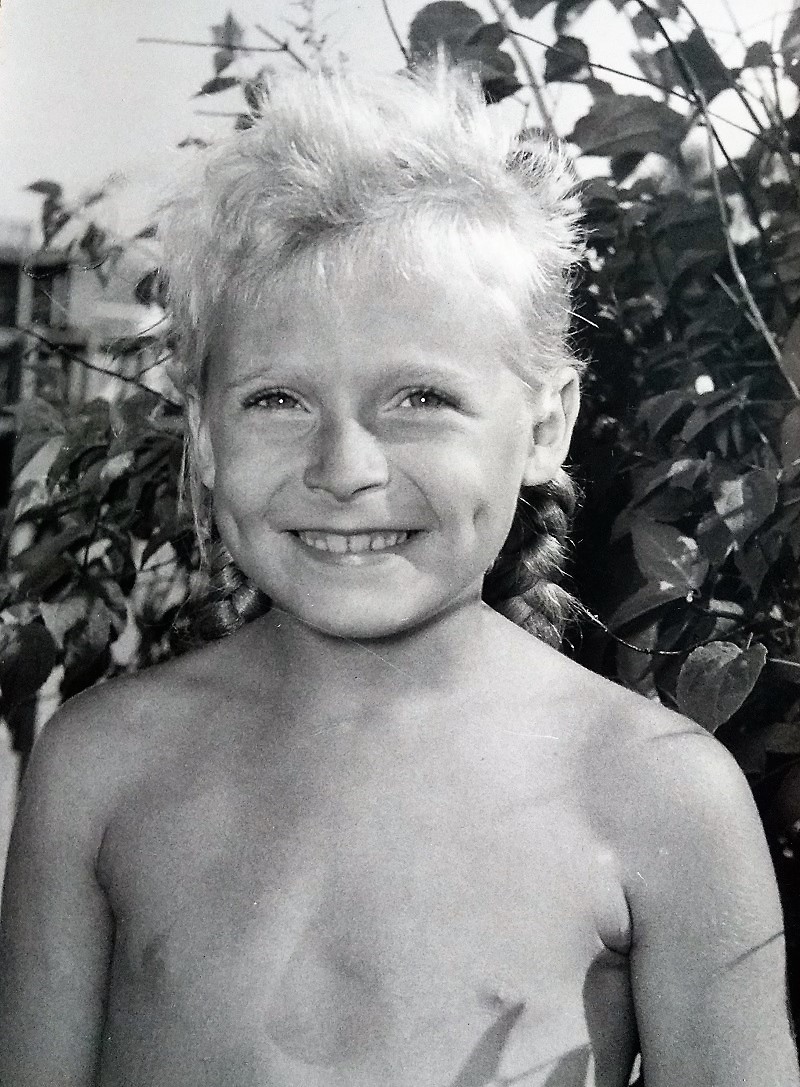 Lena har bläddrat i albumet. Jag har inget minne av varken gårdsmusikanter eller fotografer, men hittar bildbevis på att åtminstone fotograferna fanns: en bild av mig framför en buske ute på gårn bakom huset (eller möjligen i gungparken), tydligen fångad mitt i leken.