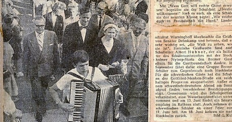 Lena glömmer aldrig skolresan till Bremen 1961: Reseledare var vår klassföreståndare Yngve Lundell och hans hustru Anne-Marie Lundell, som går direkt bakom dragspelaren på bilden från den tyska lokaltidningen. Bakom dem går jag och pratar med klasskompisen Ingrid.