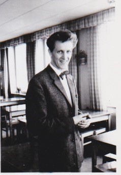 På bilden är han dessutom en av de tre manliga lärarna som bär fluga.