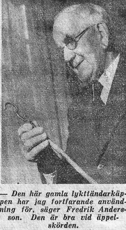 En av de intervjuade i tidningsartiklarna är Enskedes gamle lykttändare Fredrik Andersson, som tidningen kallar ”spänstfenomenet framför andra”. Bilden visar hur han vid 90 års ålder klättrar på stegen för att beskära sina äppelträd (iförd hatt och kostym med väst!).