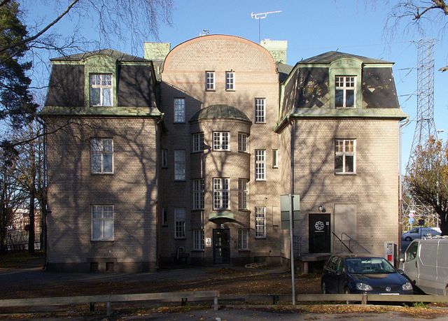 I nästa hus, närmast järnvägen, bodde inspektor, hallmästare, maskinister och förmän i fyra lägenheter om 3 rum och kök samt två med 2 rum och kök. Vi tog kort från gatusidan, på Wikipedia hittade vi bild på den fina ingången på andra sidan.