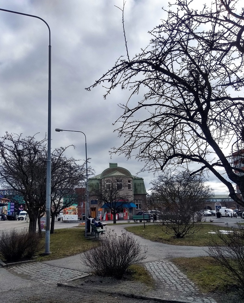 På bilden av miniparken framför den gamla portvaktsstugan skymtar troligen en mycket arg man. Jag såg honom inte, men när jag sänkte mobilen stod han där, spände ögonen i mig på så nära håll att jag hade kunnat nå att pussa honom (och möjligen bli ihjälslagen). Och så skällde han: ”VAFAN GÖR DU, DIN J…” började han, sen blev han grov i mun. Jag rätade ut alla mina 158 cm och backade INTE, i någon diffus tanke på att då följer de efter (eller det kanske är arga hundar/björnar?). Till slut tröttnade mannen och klev iväg, skrikande att jag skulle sticka därifrån. Vilket jag redan gjort om inte någon stått i vägen. För vi hade (som tur var) just fotograferat färdigt och var på väg till bilen.