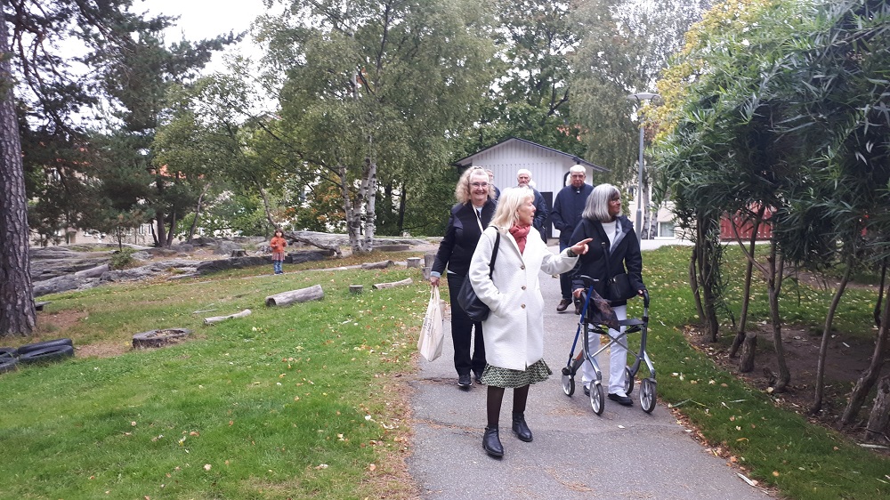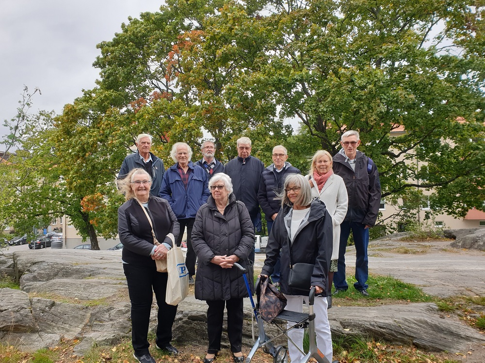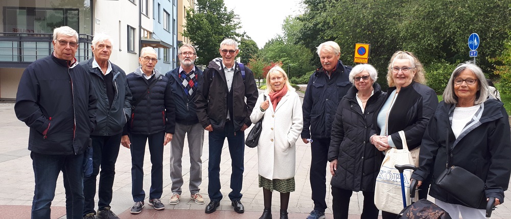 Hans-Göran berättar: Torsdagen den 16 september kl. 14 träffades 11 förväntansfulla klasskamrater för en återträff efter drygt 60 år. Vi startade med fika på pizzerian IL COURE Ristorante vid Blåsut T-banestation för att därefter ta en gemensam promenad till vår gamla skola – eller rättare sagt platsen där Röda skolan en gång låg. Eftermiddagen och kvällen avslutades senare på restaurang Enskede Matbod för gemytlig samvaro, mat och dryck.