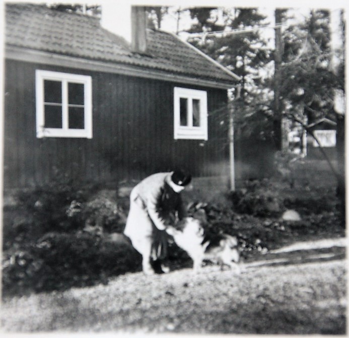 Bilden visar Ebba utanför lillstugan som den såg ut före renoveringen. Observera blindfönstret till vänster. Det andra är köksfönstret.