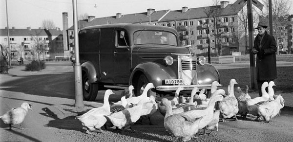 Rolf minns att en gåsmamma med sina telningar ibland korsade Nynäsvägen diagonalt från Caltexmacken över till Tant Elsas hörn med konditoriet, tvärs över rondellen med gräsmattan. Alltmedan trafiken alltså stod närmast andäktigt still och väntade på sin tur att få använda Nynäsvägen.