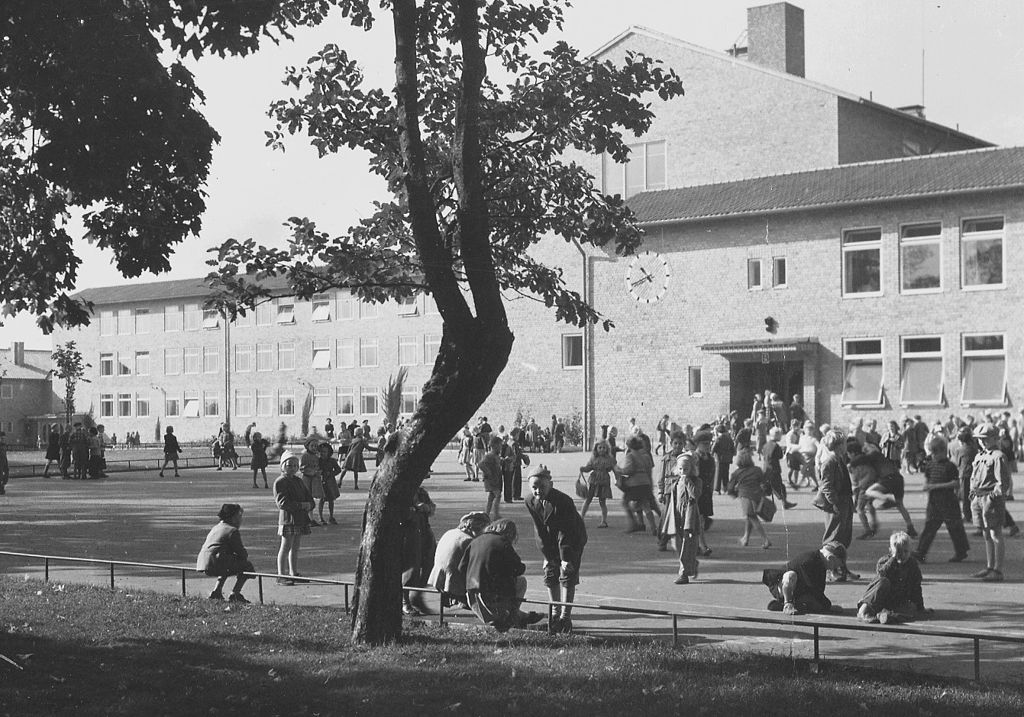 Bilden överst på sidan visar Gubbängens folkskola 1950, av Lennart af Petersens (PD) Digitala Stadsmuseet via Wikimedia.