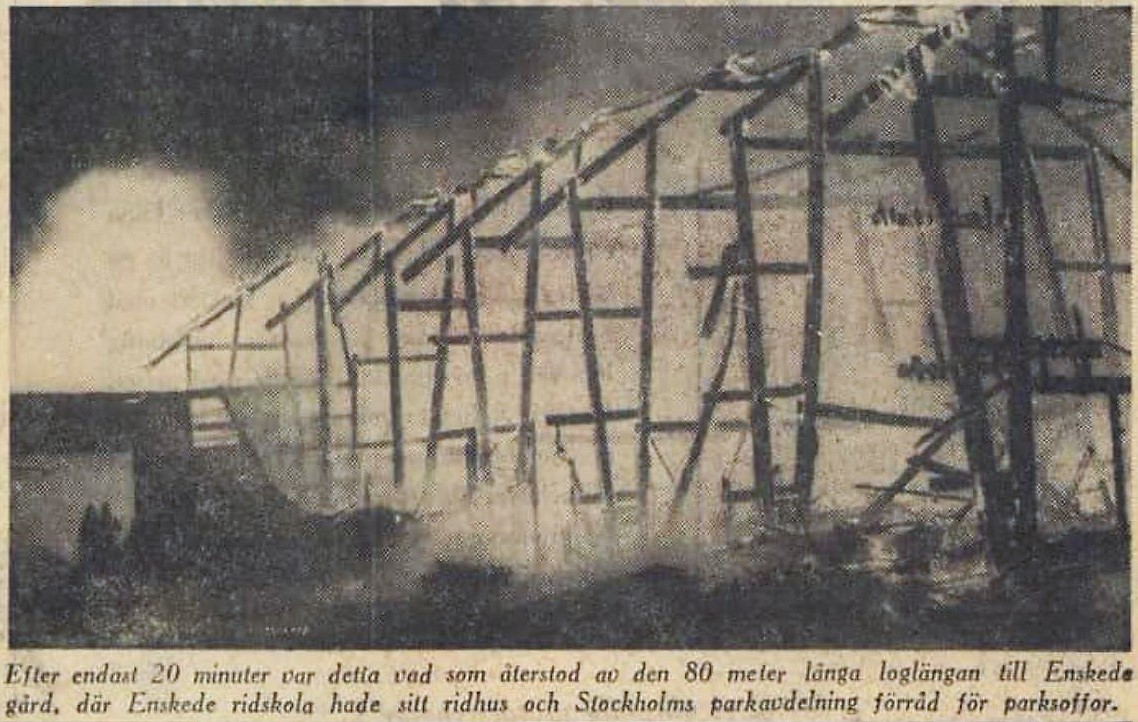 Och där börjar jag med den stora branden vid Enskede gård. Vi hade barnflickor och någon av dessa tog oss barn bort till branden vilket vi tyckte var spännande. När den var släckt fanns en del murrester kvar men som tur var låg stallet en bit närmre Enskede Gård så varken arbetshästar eller ridhästar blev så berörda. Apropå det där med ridhästar så kommer jag ihåg hur en häst kom i sken längs Sockenvägen och tjejen som satt på den hade inte lätt att hålla sig kvar. Vad jag kommer ihåg är att hästen med ryttarinna försvann bort över Enskedevägen och spårvägen.
