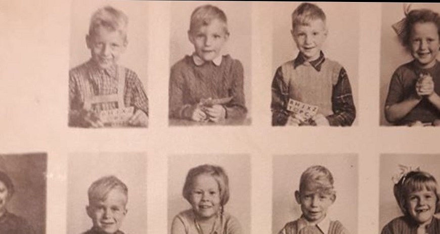 Hans-Göran och Lena visar klasskort från lågstadiet.